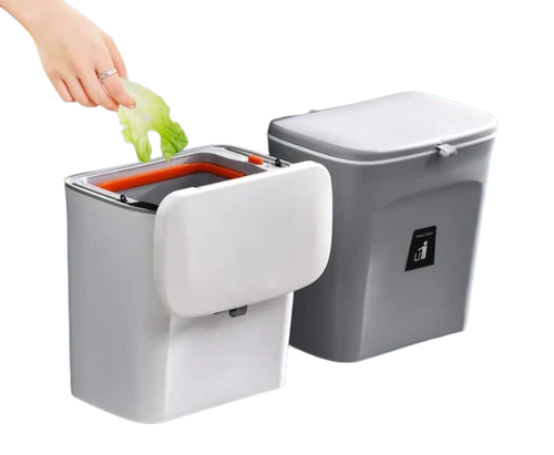 Lixeira Suspensa para Cozinha Compacta oferece um design inovador com uma tampa deslizante, eliminando a necessidade constante de abrir e fechar portas de armários ao lidar com resíduos durante o preparo de alimentos.